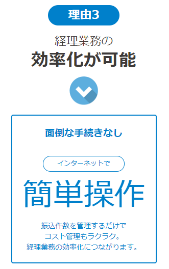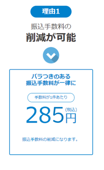 膨大な送金件数を確保することによるボリュームディスカウントを活用し、銀行振込手数料を振込先や振込額に関係なく一律285円(税込)でご利用頂けるサービスです。また、給与振込はさらに格安の153円で行えます。